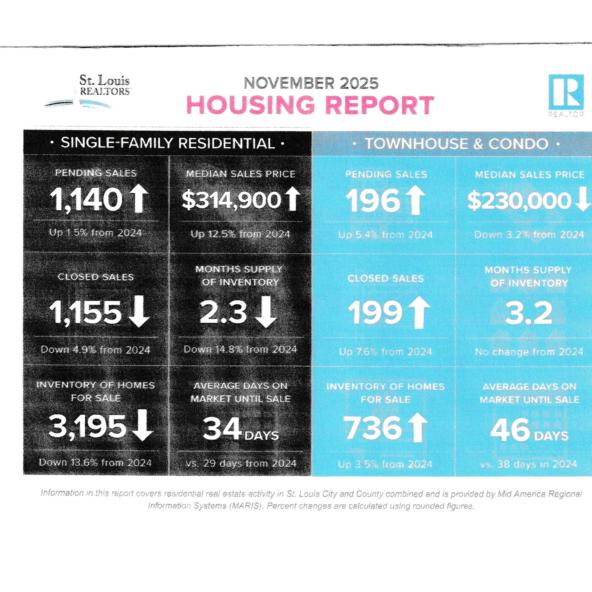 Real estate markets are local, meaning that what is happening in the St. Louis market may or may not be happening somewhere else. Below is the latest available snapshot of the St. Louis market provided by St. Louis REALTORS.